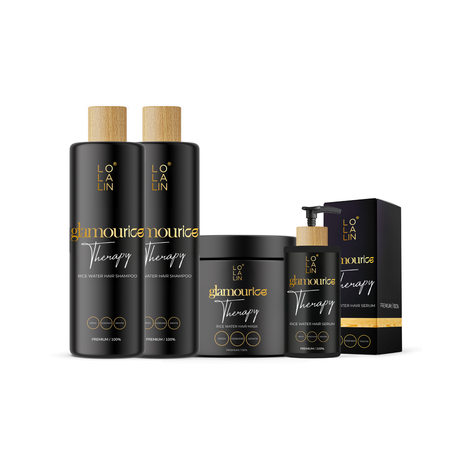 Customizable rice water kit for all hair types, in a luxurious travel bag.