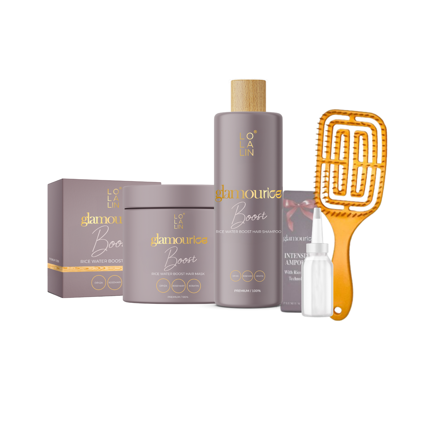 comprehensive hair care kit suited to dry or damaged hair, based on a rice water formula rich in proteins, vitamins, and amino acids. It includes a restorative shampoo, restorative mask, anti-hair-loss ampoule, and a detangling brush—all working together to restore strength, shine, and vitality to your hair.