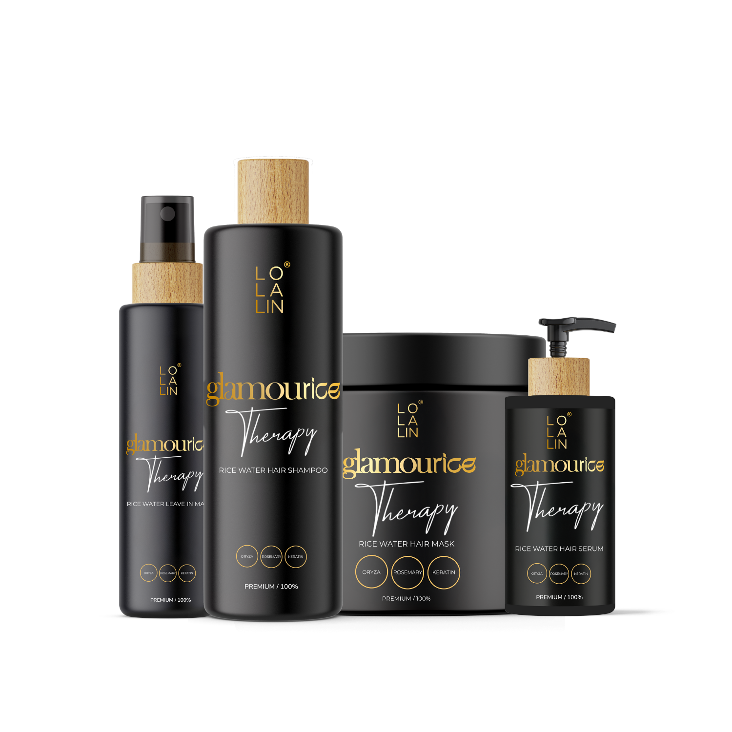 Customizable rice water kit for all hair types, in a luxurious travel bag.